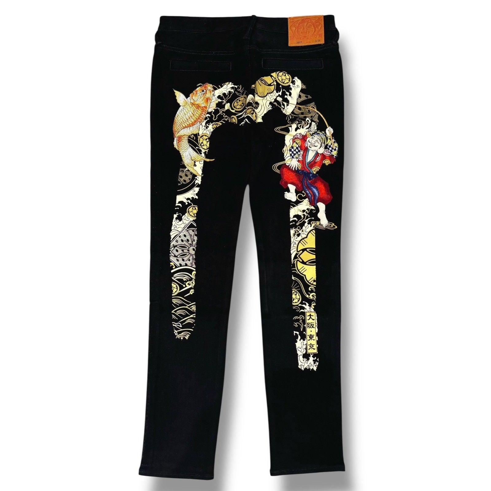 2017 Carrot fit Fisherman God of Fortune and Koi embroidery, Kamon and wave pattern Daicock print, Button fly, 5 pockets, Godhead leather patch, 99% Cotton, 1% Spandex.